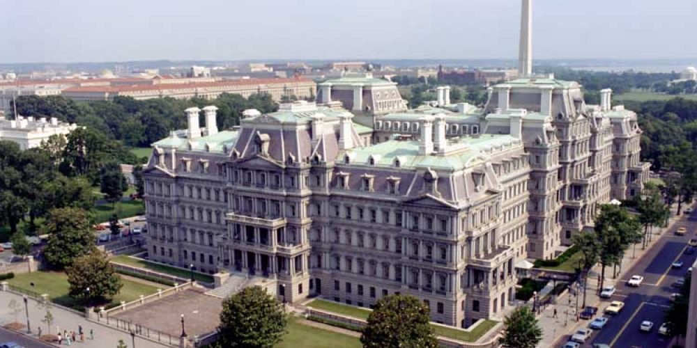 La construcción del edificio fue encargada por el presidente Ulysses S. Grant y fue construido entre 1871 y 1888, en el lugar del edificio original de 1800 Guerra / Estado y Marina y los establos de la Casa Blanca, al estilo del Segundo Imperio Francés. Como sugiere su primer nombre, inicialmente se construyó para albergar tres departamentos. Fue durante años el edificio de oficinas más grande del mundo, con 566 habitaciones y aproximadamente 10 acres (40.000 m2) de superficie. Muchos empleados de la Casa Blanca tienen sus oficinas en él.