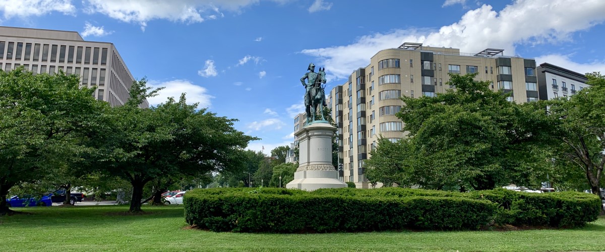 La estatua ecuestre del General Scott, de casi 5 metros de altura, fue esculpida en bronce por Henry Kirke Brown, y fue colocada inicialmente en la Plaza Scott, en los terrenos de la actual Plaza McPherson. En 1874, fue mudada a su ubicación actual.