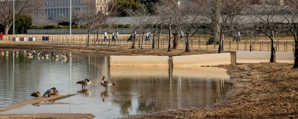 Tidal Basin conecta siglos de historia estadounidense e incluye monumentos a Thomas Jefferson, Franklin Delano Roosevelt y Martin Luther King Jr. Aproximadamente 1,5 millones de personas caminan a lo largo del borde de la cuenca durante el Festival anual de los cerezos en flor (Cherry Blossom) cada primavera. Pero con el aumento del tráfico de automóviles y peatones, el suelo se está hundiendo. A medida que aumenta el nivel del agua, las aceras se inundan a diario.